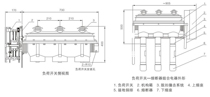 1.负荷开关和组合电器由相同的绝缘躯壳开关本体、各自的弹簧操动机构、熔断器头座和熔断器动作捶击脱扣系统组成。