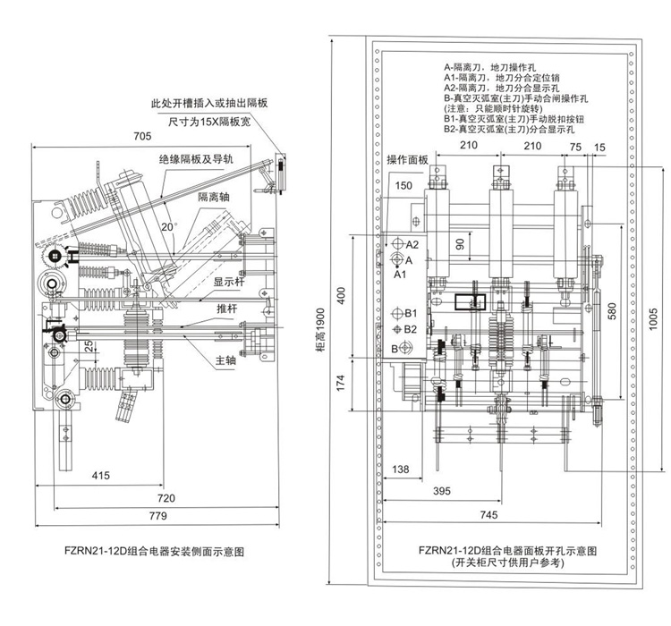 FZN21-12D/T630-20、ZFN21-12DR/T125-31.5型高压真空负荷开关及组合电器用于三相交流12kV、50Hz的配电系统中,具有结构紧凑、体积小、重量轻、寿命长、关合开断能力强、安全 可靠等优点,与熔断器配合使用(简称组合电器),可替代造价较高 的断路器,其操作和维护简单方便。